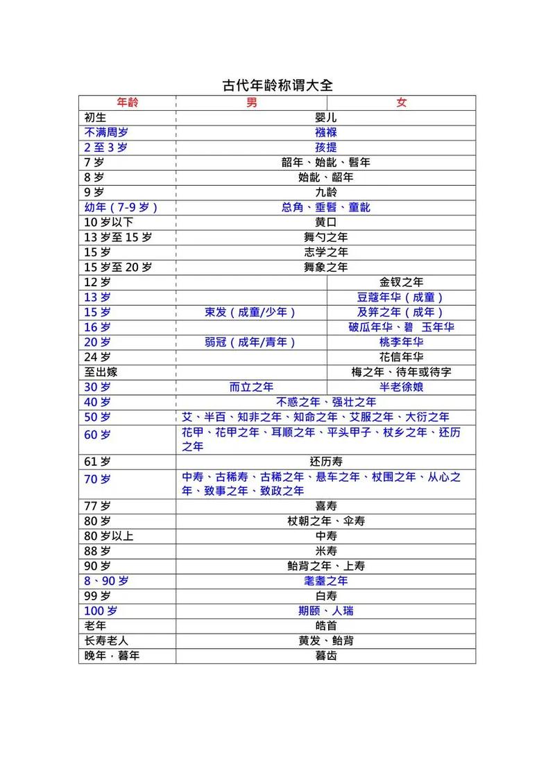 古代年龄称呼背后有何深意? 年龄称呼(按年龄段划分)古人的年龄称呼非常讲究,常常与数字、生理特征、文化典故相结合,充满了诗意和礼制色彩,婴幼儿期 (0-8岁)襁褓 (qiǎng bǎo): 指不满周岁的婴儿,襁是背负婴儿的宽带,褓是包裹婴儿的被子,孩提: 指二三岁的幼儿,“提”是抱着的意思,《孟子·尽心上》:“孩提之童,无不知...