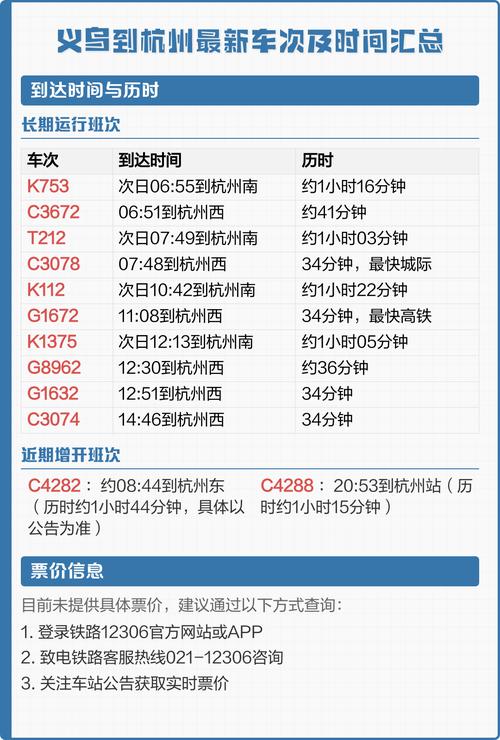 义乌到杭州汽车要几小时? 正常情况下,乘坐大巴大约需要 1.5 到 2.5 小时,下面为您详细分解几种常见的情况:义乌汽车站 → 杭州各大汽车站(最常见)这是最传统的大巴方式,班次非常多,性价比高,义乌汽车站(宾王路):目的地:杭州汽车南站、杭州汽车西站等,车程时间:约 5 - 2 小时,说明:这是最经典和最常见的线路,大巴...