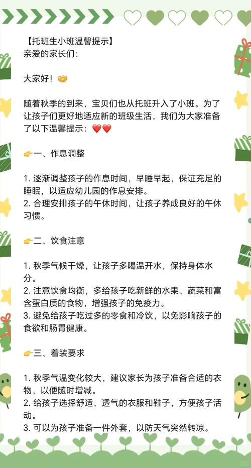 幼儿园秋季养生有哪些关键小常识? 幼儿园秋季养生小常识:守护宝贝健康,快乐过秋天秋天,天高气爽,景色宜人,但同时也是“多事之秋”,天气转凉、干燥,早晚温差大,小朋友的抵抗力较弱,容易生病,为了让宝贝们健康、快乐地度过秋天,我们需要做好以下几点“养生功课”,穿衣篇:“洋葱式穿衣法”,灵活应对温差秋季最大的特点就是“早晚凉,午间热”,给...